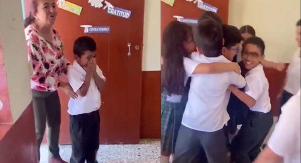 En redes sociales se ha viralizado un video donde se ve un pequeño niño llegar a su salón de clases, dónde su maestra y alumnos le tenían una gran sorpresa, le habían adornado el salón por su cumpleaños, el niño al no creer lo que estaba viendo se cubrió el rostro y comenzó a llorar inconsolable por lo que sus compañeros se acercaron y loa abrazaron.