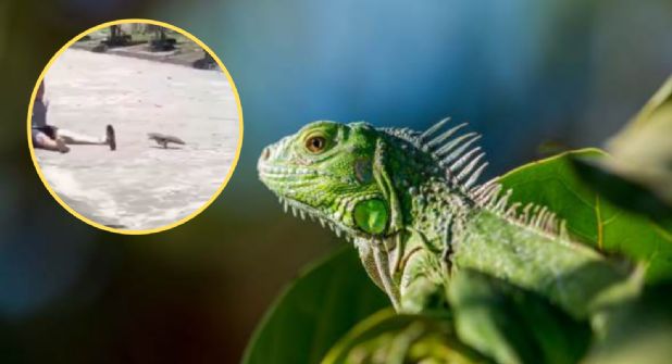 Y en un divertido momento, la correa que sujetaba a la iguana se desprende y este se dirige hacia su dueño para atacarlo. A lo que el hombre corre de espalda asustado por el ataque del ejemplar.
