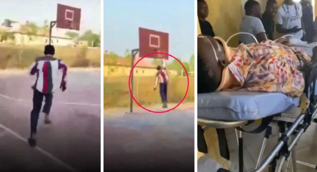 Las imágenes muestran al joven de 20 años correr hacia un aro de basketball, con la intención de tomarse de la red para columpiarse. Desafortunadamente falla en su intento, cayendo en el suelo abruptamente.