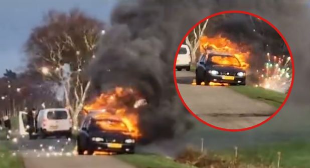 El susto de su vida se llevaron un par de jóvenes, quienes por un descuido con un cigarrillo hicieron explotar su vehículo junto con 75 kilogramos de pirotecnia que traían esto en Países Bajos.