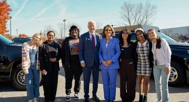 Biden se dio la oportunidad de platicar con personas que se encontraban haciendo fila, incluso ayudó a una mujer que iba en silla de ruedas.