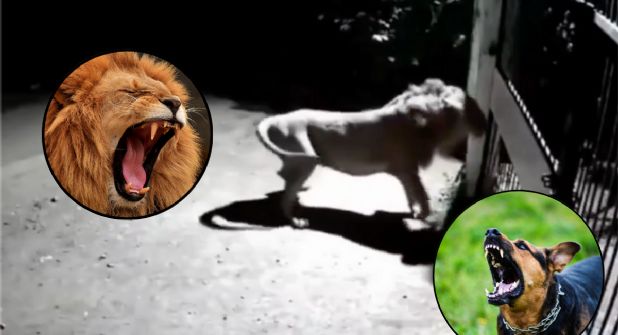 Una cámara de vigilancia grabó el momento en que un par de felinos se aproximaron a un domicilio, desde la reja de la entrada uno de los leones encaró a los perros que se encontraban al interior, el cual comenzó a ladrarle mientras el felino buscaba hacerle daño con sus garras.