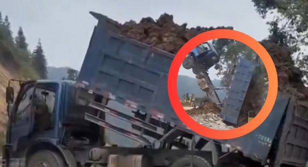 Un impresionante accidente ocurrió en China cuando un camión, al borde de un barranco, perdió el equilibrio mientras descargaba tierra.