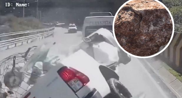 Una cámara instalada en el tablero del automóvil que estaba detrás de la camioneta captó el momento en que una enorme piedra se desprende de un cerro y cayó hacia la carretera. En la imagen aparece la camioneta tipo pick-up, y más adelante, una camioneta tipo van.
