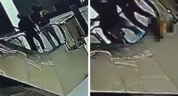 Al acercarse a la escalera eléctrica para subir al cuarto piso, el hombre se detiene y toma al otro niño, cuando repentinamente el bebé que llevaba en brazos se le cae al vacío.