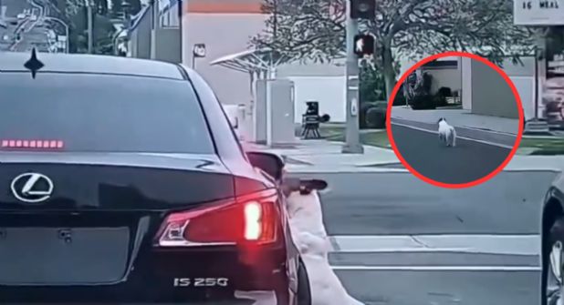 Las imágenes captadas en video, muestran como un perro de tamaño mediano está junto a un auto, mientras el tráfico está detenido por el semáforo en rojo.