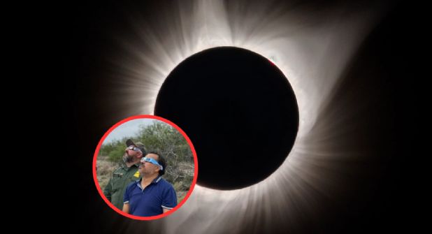 En la imagen se pueden observar a tres sujetos, acompañados por un elemento de la Patrulla Fronteriza, mirando el eclipse.