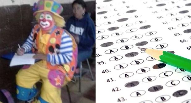 Sorpresa que vivieron los compañeros de clase al ver llegar al estudiante vestido de payaso, por lo que varios decidieron tomar algunas fotografías del momento, en una de ellas se ve al payaso sentado en el pupitre escribiendo en unas hojas lo que aparenta ser el examen.