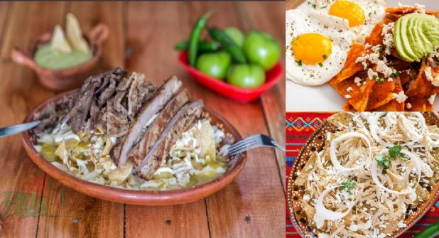 Los chilaquiles se caracterizan por su elaboración con trozos de tortilla de maíz, ya sean bañados en salsa verde o roja, que pueden acompañarse con huevo, pollo o carne de res, cebolla, crema y queso.