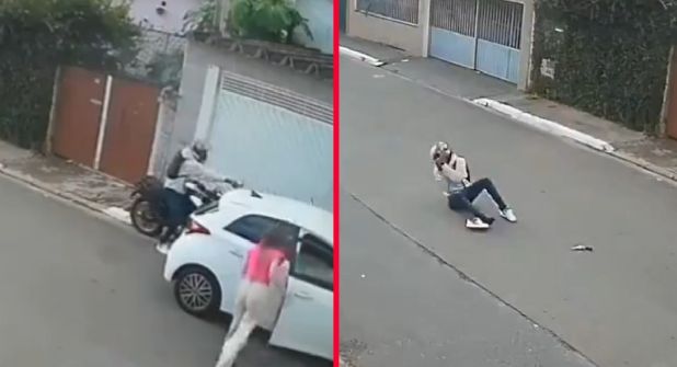 Las imágenes muestran al sujeto llegando hasta la casa en un automóvil blanco, y deteniéndose en la entrada. Al bajarse junto con su pareja, es abordado por un ladrón en motocicleta, quien lo estaba vigilando desde hacía varios minutos para robar sus pertenencias.