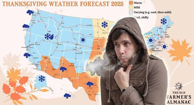 Según The Old Farmer's Almanac más de la mitad de Estados Unidos no podrá disfrutar de un cálido Día de Acción de Gracias. Mientras que parte del Oeste tendrá lluvias y en algunas zonas se presentarían nevadas, en el Este habría clima templado. Algunos estados del Este también registrarían lluvias y nieve.