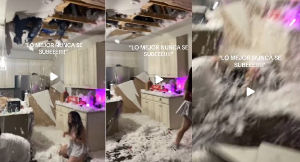 En el clip, la familia disfruta dentro de casa hasta que, de un segundo a otro, el techo cede y se derrumba, de él, caen dos personas directamente al piso, cubiertas de pintura, polvo y pedazos de concreto.