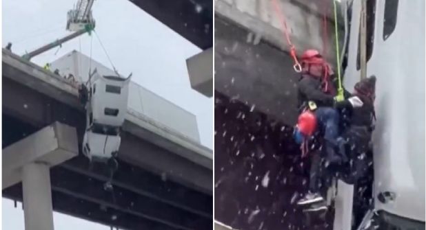 Esto sucedió en la autopista 35 de dicho estado. El pesado vehículo, de 18 ruedas, colisionó contra el muro de contención y se ‘dividió’. Se puede notar que la parte de la caja del tráiler quedó en la carretera, pero la cabina amenazaba con tener una caída libre de aproximadamente 40 metros.