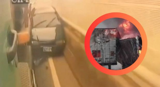 Este jueves, un conductor de un Toyota Tercel estuvo a punto de ser aplastado por un camión en una carretera de Nuevo Taipéi, Taiwán. El incidente ocurrió cuando el hombre, mientras circulaba entre la barandilla lateral y el carguero, no se dio cuenta de que el carril se estaba estrechando.