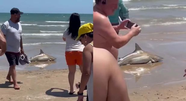 Un tiburón fuera del mar alertó a los bañistas en una playa de Texas, pues el animal de grandes dimensiones se puede ver sobre la arena. No es la primera vez que un ejemplar de estos es visto en playas de Texas, incluso se han reportado ataques de estos peces hacia bañistas dentro del mar.