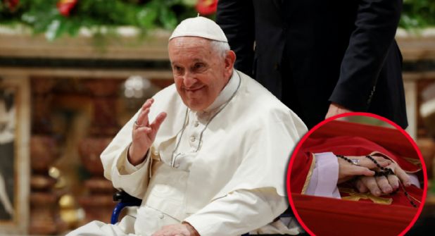 Las fotografías muestran a Jorge Mario Bergoglio acostado en el ataúd designado para su último descanso, forrado con terciopelo rojo, con sus santos ropajes y cargando en las manos un rosario.
