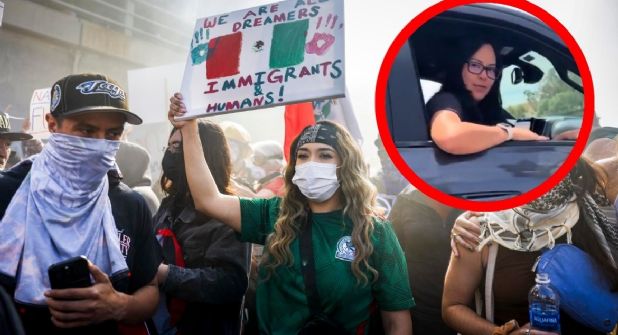 Las imágenes muestran a la mujer en un vehículo exigiéndole a los migrantes que regresen a sus países de origen, mientras su esposo intenta cruzar entre la multitud que se manifestaba contra el gobierno de Estados Unidos.