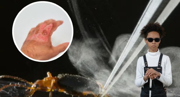 Estas sustancias químicas reaccionan produciendo una explosión que eleva la temperatura del líquido expulsado hasta los 100 grados Celsius provocando severas quemaduras en el cuerpo humano, además, el chorro sale expulsado en forma de ráfagas que pueden alcanzar las 500 explosiones por segundo.