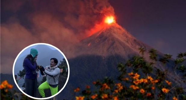 Una pareja en protagonizó un momento único y espectacular cuando un hombre decidió pedir matrimonio a su novia con el Volcán de Fuego de fondo, pero cuando el acto se levaba a cabo, inició una erupción que quedó grabada en los celulares de las personas que presenciaban el momento romántico.