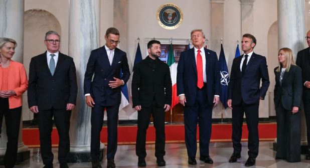 Durante la reunión, a la derecha de Trump, se encontraba el presidente francés, Emmanuel Macron y al lado de éste el primer ministro británico, Keir Starmer. A la izquierda de Trump estaba la primera ministra de Italia, Giorgia Meloni.