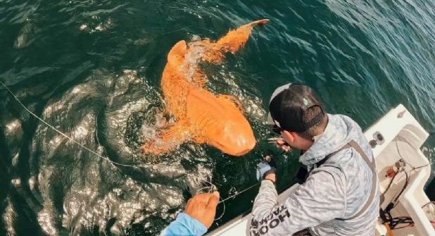 Los pescadores capturaron un tiburón nodriza de apariencia única: su piel era completamente naranja brillante y sus ojos estaban desprovistos de iris visibles, de un blanco inmaculado.