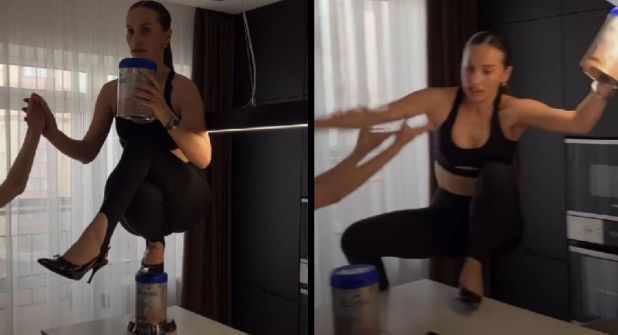 Apenas ocho semanas después de haber dado a luz a su primer hijo, Barutkina decidió grabar contenido para su blog. El reto consistía en replicar una compleja pose sobre una encimera de cocina, usando tacones de aguja y apoyándose sobre un frasco de comida para bebé colocado sobre una cacerola.