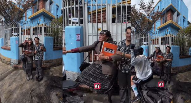En el lugar lo esperaba el actor Richard Evans, caracterizado como Beatriz Pinzón Solano con su icónico flequillo, gafas y carpeta de Ecomoda.