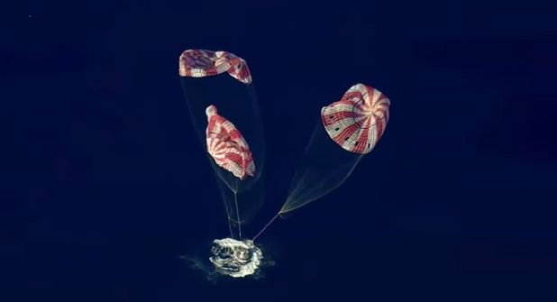 Poco después, a menos de dos mil metros del océano, se abrieron los tres paracaídas principales, enormes velámenes de color naranja que disminuyeron el descenso a una velocidad segura para el impacto.