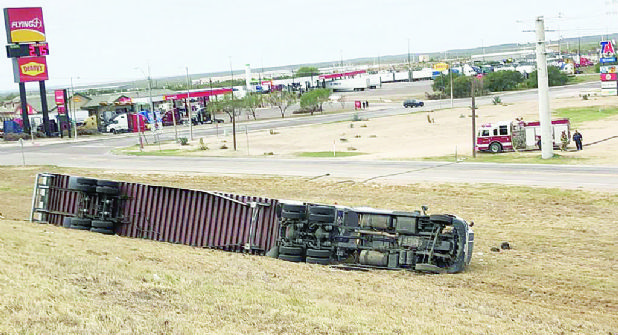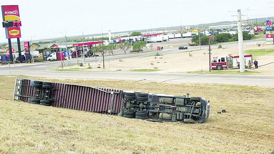 LAREDO, TX.- Un tráiler cargado de tanques de óxido nitróxido volcó ayer en la mañana en la milla 13 de la carretera interestatal 35, por lo que bomberos, paramédicos y policías implementaron un operativo de materiales peligrosos, al tiempo que la importante vía fue cerrada en su camino al norte, sólo el chofer resultó levemente lesionado, y afortundamente no hubo fuga de sustancias químicas o tóxicas.