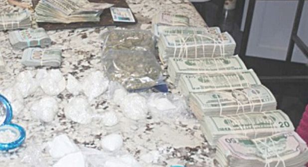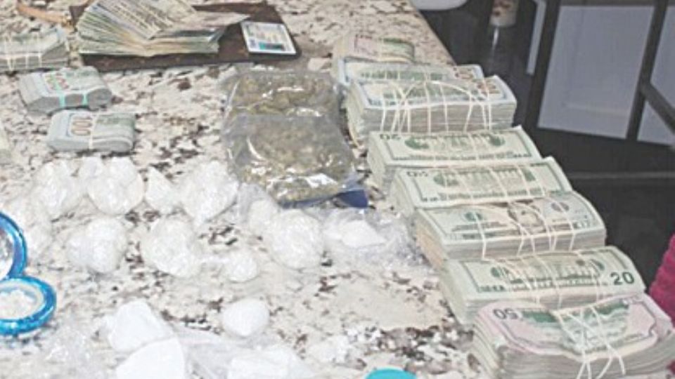 Fueron 395.6 gramos de cocaína (mil 800 dosis); 3.65 onzas de mariguana; 8.7 gramos de Xanax; y 56 mil 54 dólares en efectivo.
