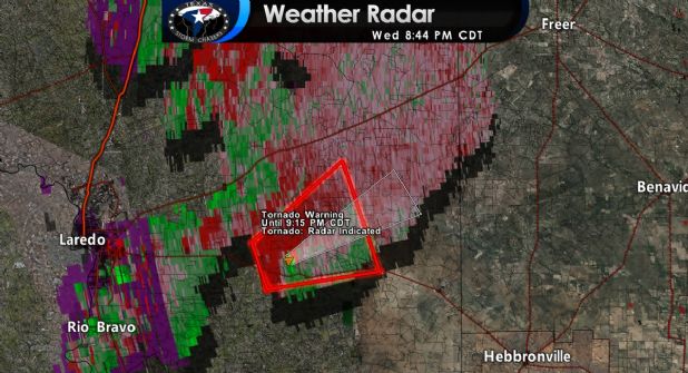 Según la página de Twitter del centro climatológico la alerta de tornado permanecerá principalmente sobre las áreas rurales del condado en el este de Webb.