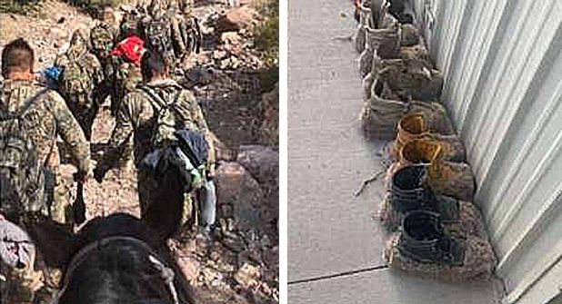"Horse Patrol en Presidio se encontró con un gran grupo de no ciudadanos indocumentados. Puedes ver la alfombra colocada en la suela de las botas. Estos 'zapatos de alfombra' se utilizan para ocultar los pasos de los grupos en el terreno desértico",.