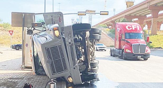 Y luego, ahí cerca, en el cruce de la 35 y el bulevar Bob Bullock, hacia el oeste, un tractor-tráiler se recostó, quedando ambas piezas en el piso, sobre el lado del copiloto.