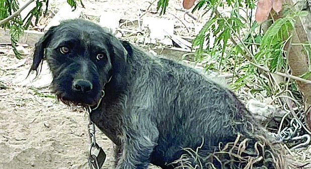 Esta mascota estaba ilegalmente encadenada directamente del cuello causando lesiones severas en su cuerpo.