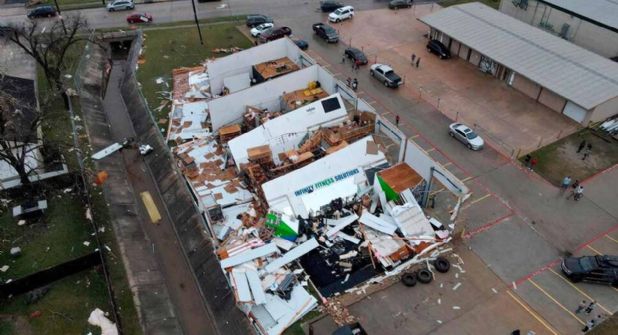 En Humble, ubicado al norte de Houston, el techo de metal de un negocio se estrelló contra una carretera, golpeando un par de casas, informó la estación local KTRK-TV.