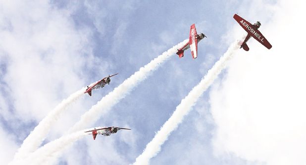 El equipo acrobático de AeroShell realiza impresionantes maniobras aéreas en formación frente a millones de fanáticos de las exhibiciones aéreas en toda América del Norte. Con Mark Henley, líder del equipo; Bryan Regan, extremo derecho; Steve Gustafson, extremo izquierdo, y Jimmy Fordham, tragamonedas.