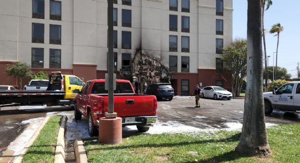 El hotel Hampton Inn, en la cuadra 79 de San Darío, atrás de la tienda de electrónicos Best Buy se incendió a las 10:22 de la mañana de este lunes, provocado por una Vagoneta que cobró fuego en el estacionamiento del lado sur y alcanzó al edificio.