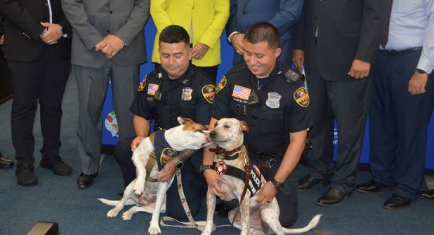 Cárdenas maneja al perro “Coco” mientras el oficial Esquivel se hizo cargo del canino llamado “Dusty”, quienes desde ahora estarán a disposición de los jueces en las cortes de distrito.