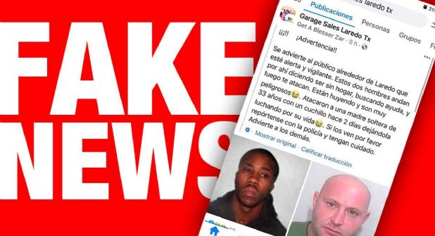 Un mensaje de redes sociales acerca de un par de peligrosos sujetos que andaban sueltos en las calles de Laredo causó zozobra entre la comunidad laredense. Resultó ser una "fake news".
