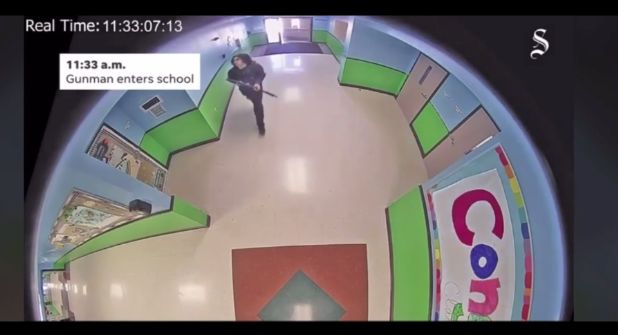 Momentos después la cámara interior del colegio capta la entrada del tirador con un arma de alto poder deambulando en el vestíbulo del edificio.