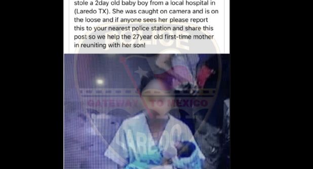 La Policía de Laredo advierte sobre la circulación de una noticia falsa acerca de una supuesta mujer haciéndose pasar como enfermera que entra y roba un bebito de 2 días de nacido en un hospital local.