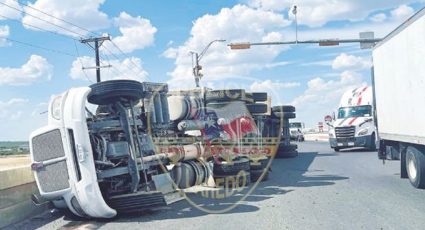 El chofer salió ileso. No hubo heridos, fue en solitario, a las 4:45 de la tarde de ayer en el paso elevado sobre la Vía Panamericana. El camión quedó de costado, sin mayor perjuicio que el susto y golpes leves al chofer, más el daño al binomio de tractor y remolque, y probablemente a la mercancía.
