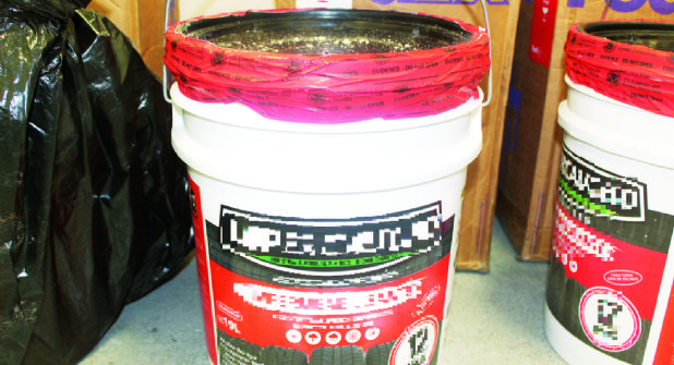 Entre el flete de comercio exterior, iban cinco cubetas, como las de 5 galones (19 litros), conteniendo un total neto de 216.09 libras de dicha droga de laboratorio.