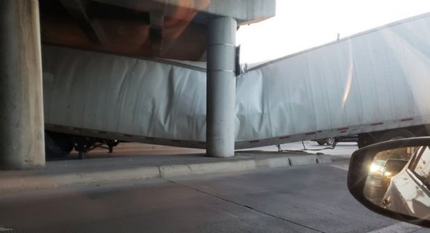 Un tráiler quedó atorado debajo de un puente ubicado en Mann Road y San Darío, en la ciudad de Laredo, Texas, sin que se hayan reportado desgracias personales ni lesionados. Sin embargo, las labores de maniobras duraron varias horas y a las 21:00 horas los conductores reportaban que el camión de carga pesada aún se encontraba prensado.