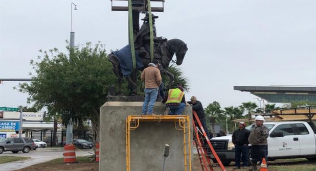 El monumento que muestra al Padre de Laredo en un caballo, quedó ubicado en la primera cuadra al cruzar el puente internacional Juárez-Lincoln hacia el lado americano.