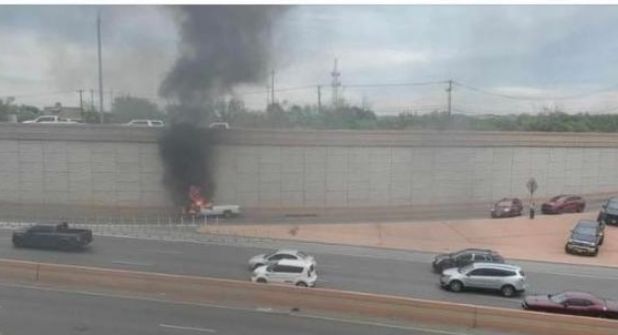 Una camioneta tipo “pick-up”, color blanco, de modelo no reciente, fue consumida este mediodía de sábado 07 de octubre en “Los Cántaros”, interconector vial donde confluyen las carreteras 359 y 83 Sur, así como las calles Guatemozín, Willow, Chacón y avenida Arkansas.