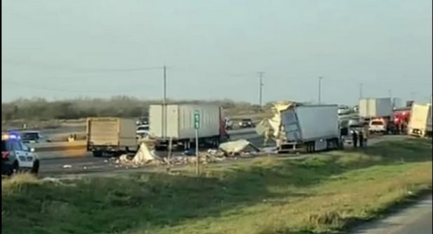 Un trailero quedó atrapado en la cabina de su camión de carga, al chocar dos tractores-remolque en la milla 10 de la carretera interestatal 35, esta mañana de martes, carriles al sur, en Laredo.