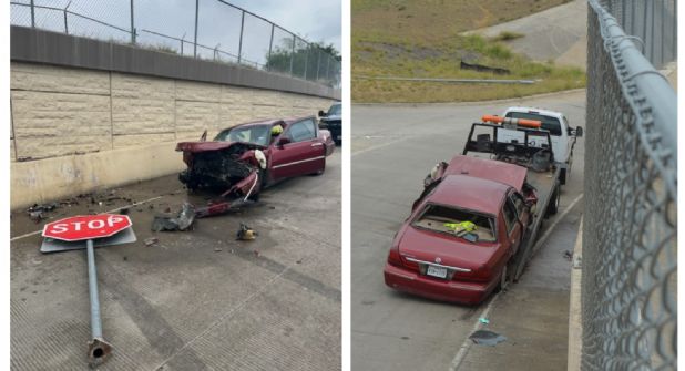 El auto Marquis, pegó de frente contra una señal vertical de “Alto” y luego de costado contra la pared de concreto de dicho libramiento que conecta con el sur de Laredo.