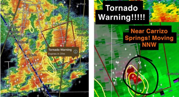 Esta noche se lanzó una advertencia de tornado, cerca de Carrizo Springs, hacia la zona este del Condado de Maverick.