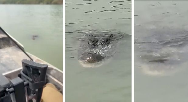 En la publicación se observa la orilla de una lancha que es conducida por miembros de la Guardia Nacional de EE. UU., cuando a un lado de la embarcación se vio como un par de ojos y nariz de un enorme lagarto emergieron de las profundidades del río.
